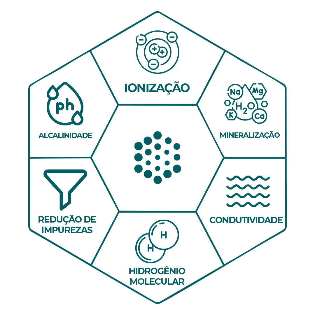 Melhora na Digestão e Absorção de Nutrientes: A melhora na solubilidade e na condutividade elétrica da água favorece a quebra de alimentos no estômago contribuindo para uma digestão mais leve e eficiente.